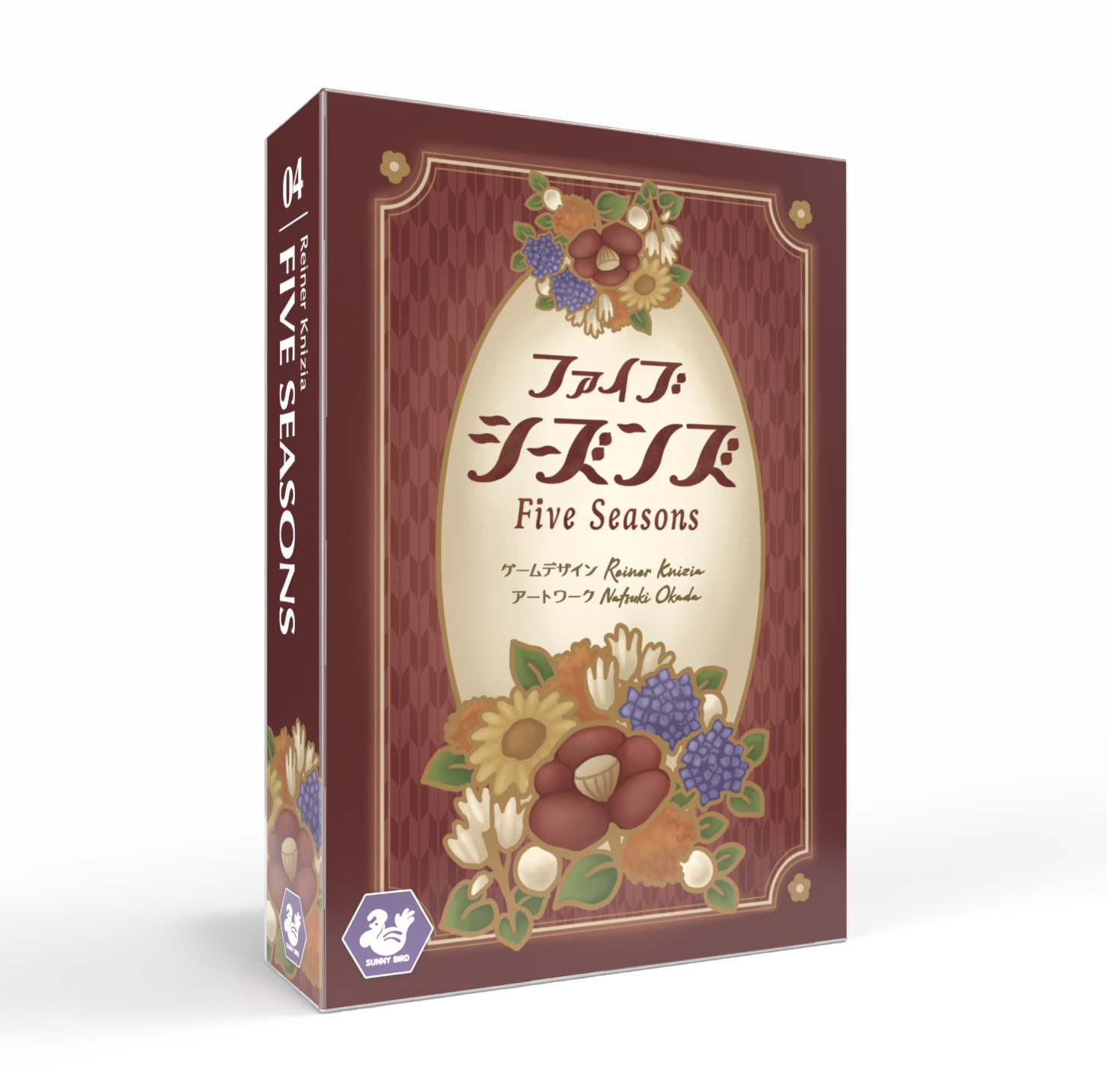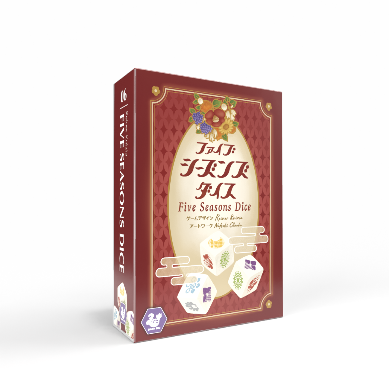 【名作小箱シリーズ第5弾】五つの季節を巡る美しいゲーム「ファイブシーズンズ」のスゴロクバージョンが新登場!5つのサイコロを振って、選んだ色のコースを進んでいきます。なるべく進んだ方が点数が上がりますが、中途半端に進むと失点になってしまうのはタイルバージョンと同じです。スゴロクの盤面はリバーシブルになっており、シンプルで誰でも遊べる表面と、柵で入れないマスがあるジレンマたっぷりの裏面があります。新版では、柵の場所が可変になったことで、毎回新鮮な気持ちで遊べるようになります。