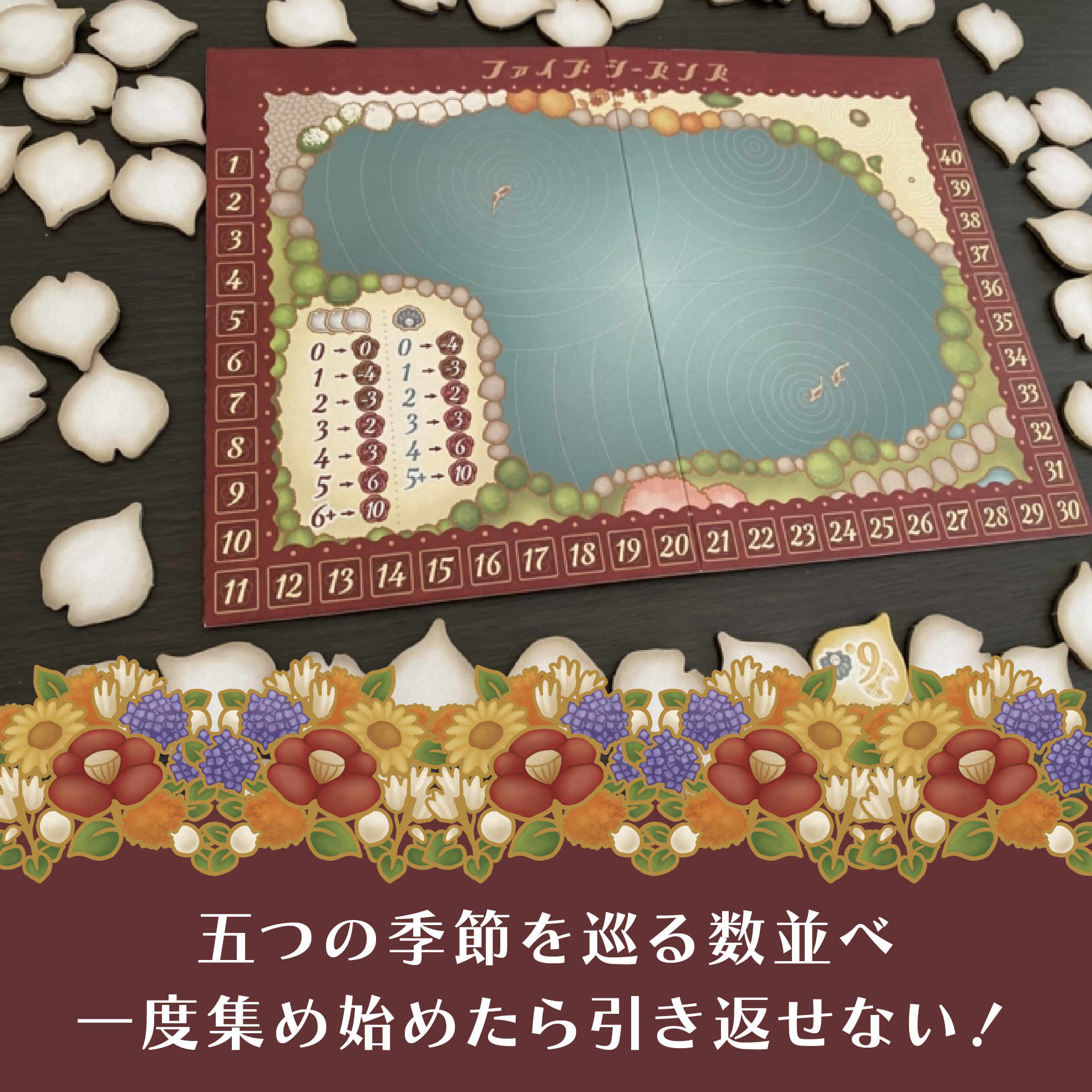 タイルを捨てるための池ボードは無くても遊べますが、花びらをそっと池に浮かべるイメージで遊ぶと風流です。