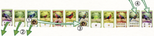 ゲーム内容としては、基本的には手番が来たら自分の駒をカード列の先の方に進めていき、