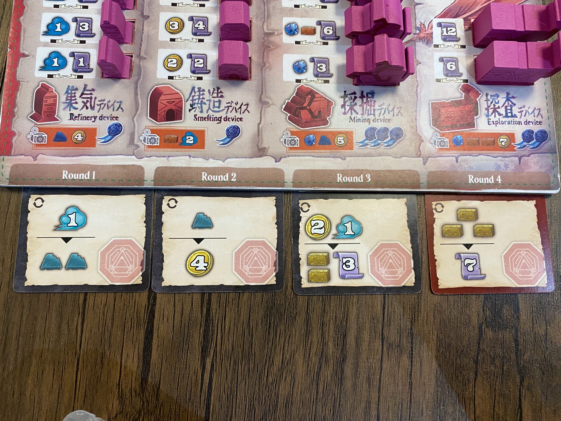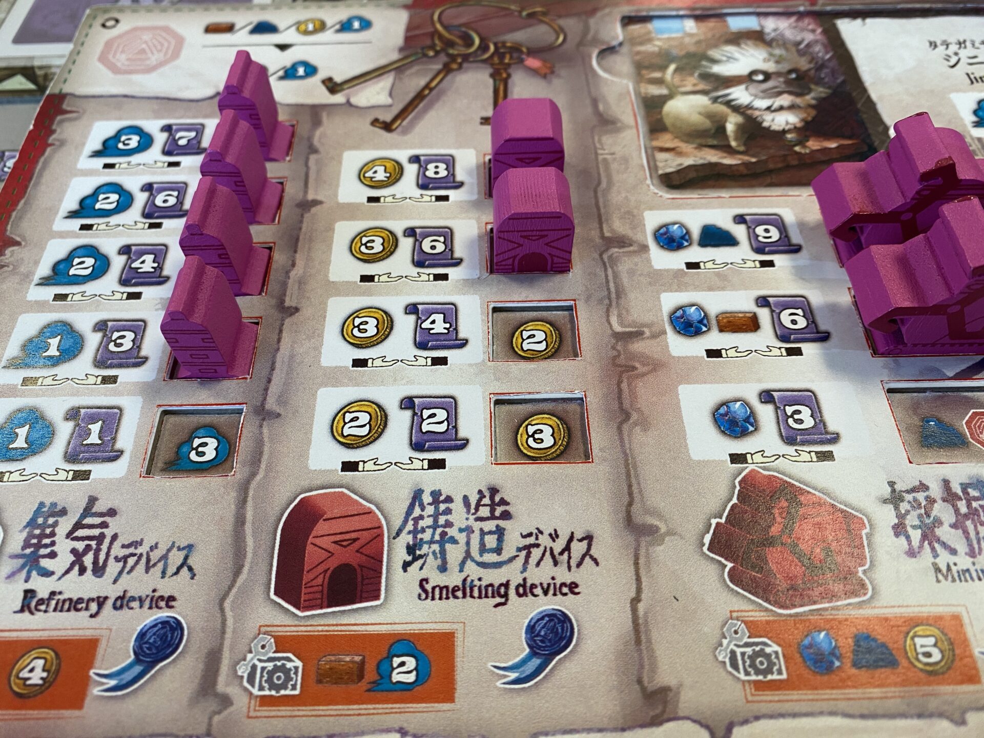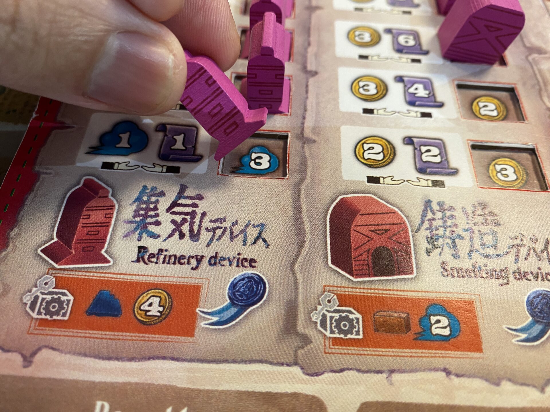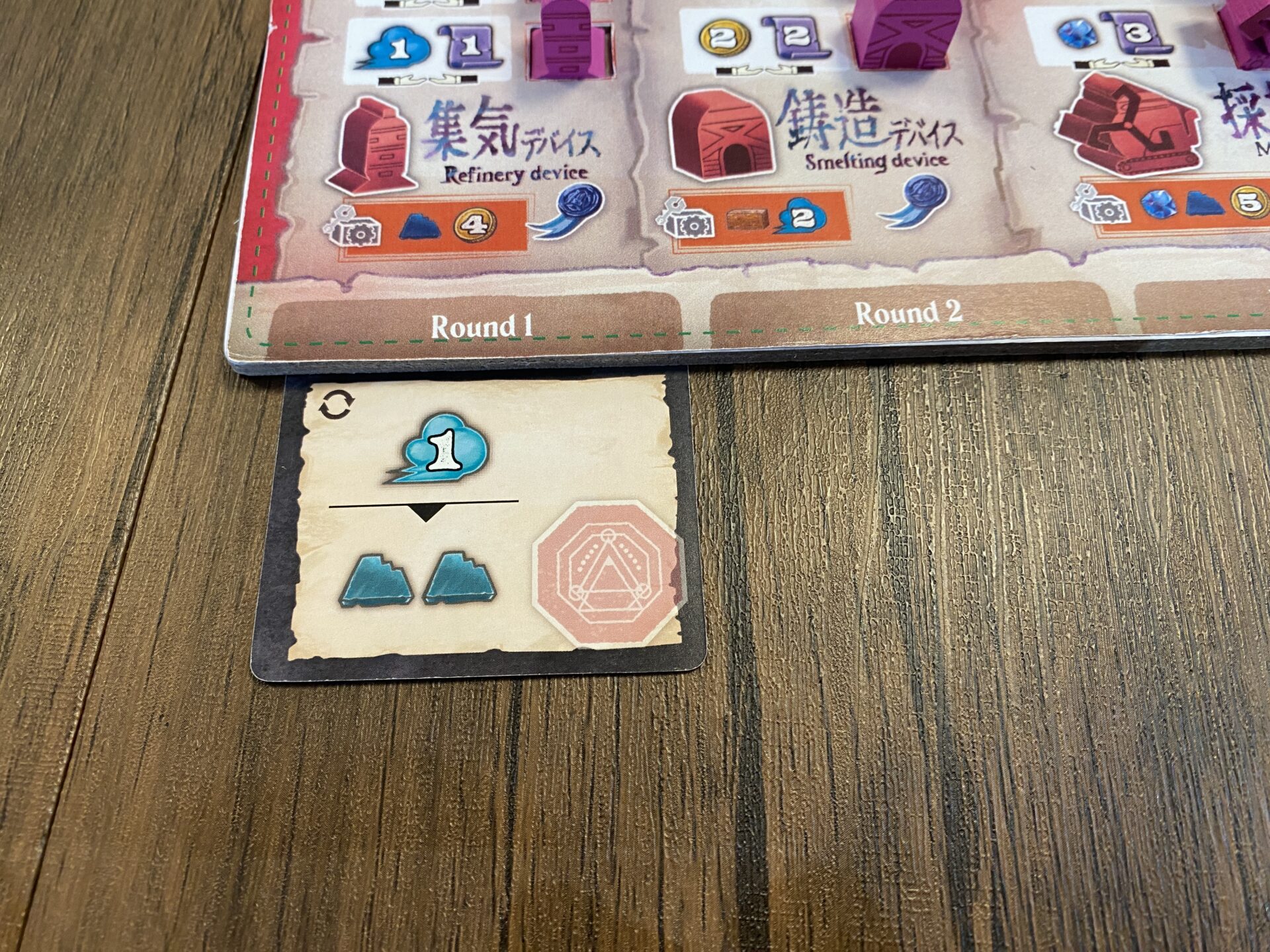 Players set devices on the main board, where there are five tiers, and get resources and victory points. There are 4 devices, such as resource collecting devices or point collecting devices etc. They all have different roles.