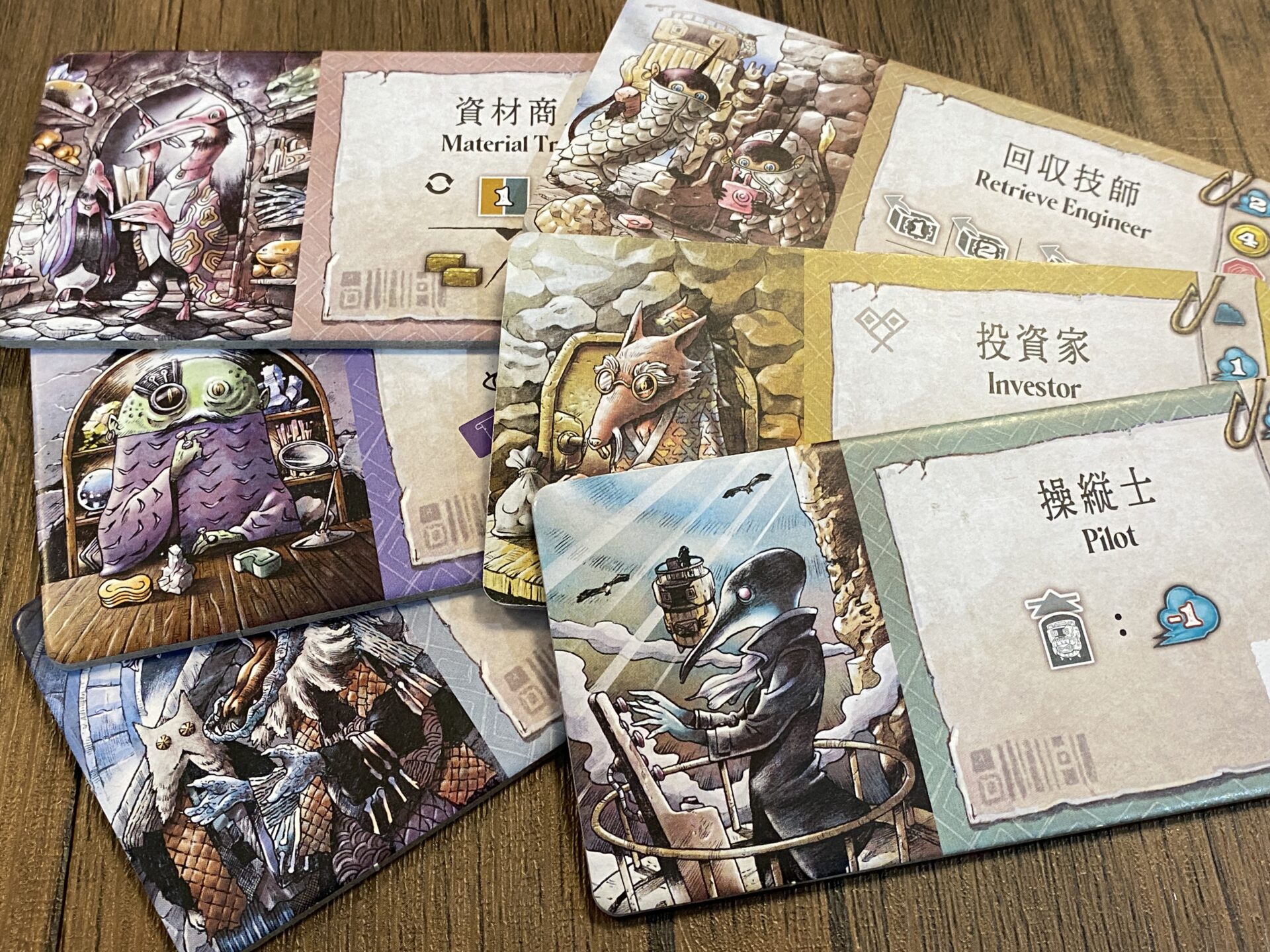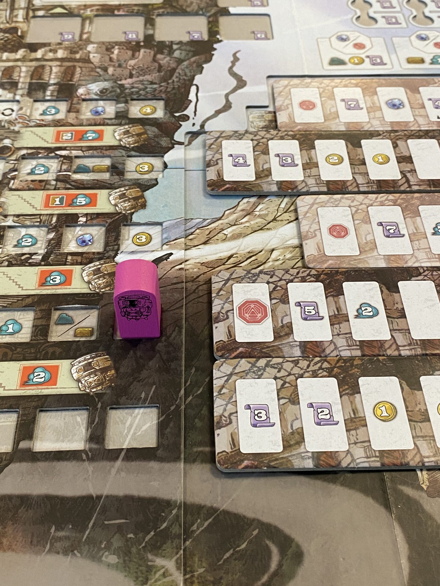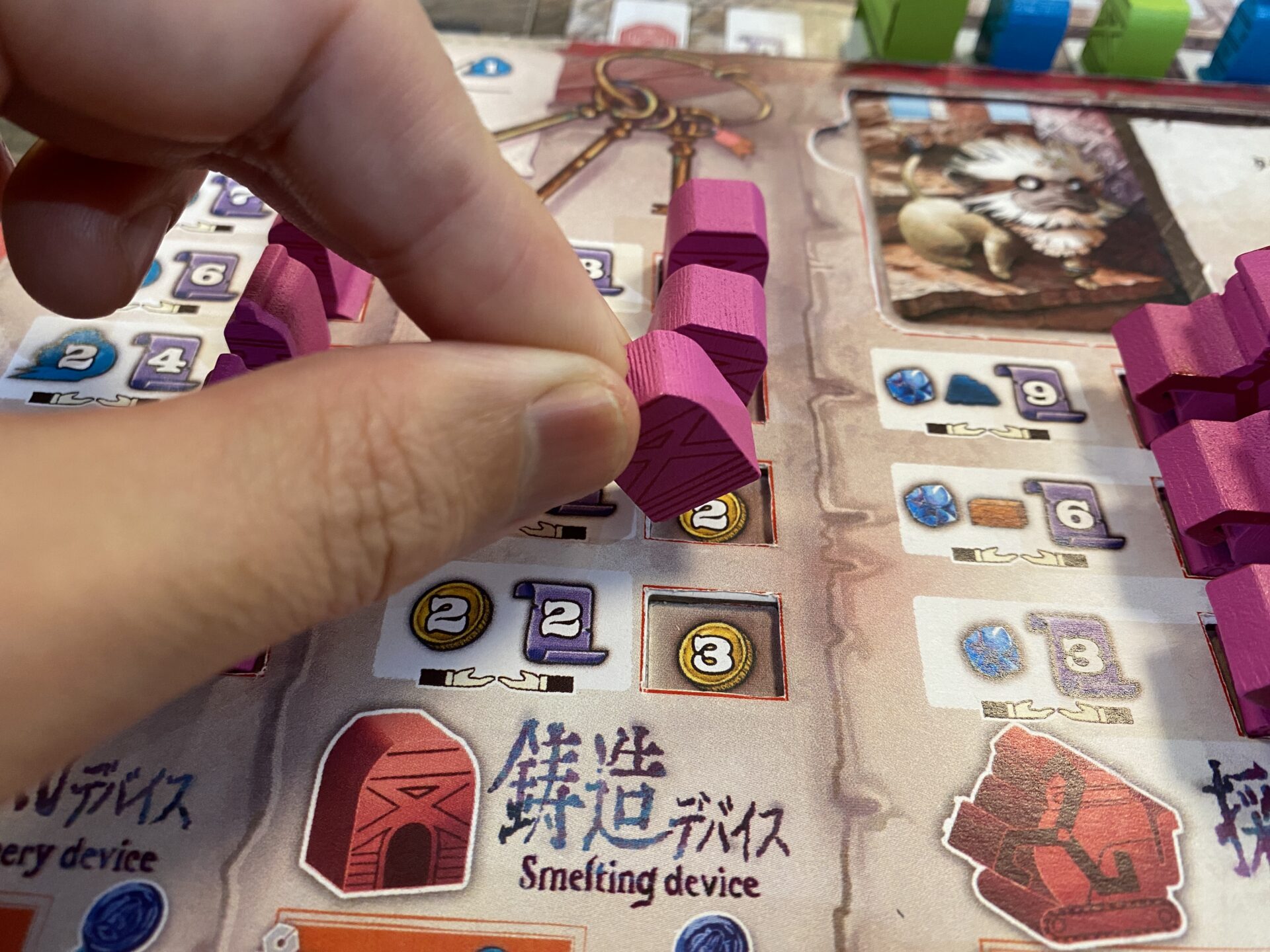 Players set devices on the main board, where there are five tiers, and get resources and victory points. There are 4 devices, such as resource collecting devices or point collecting devices etc. They all have different roles.