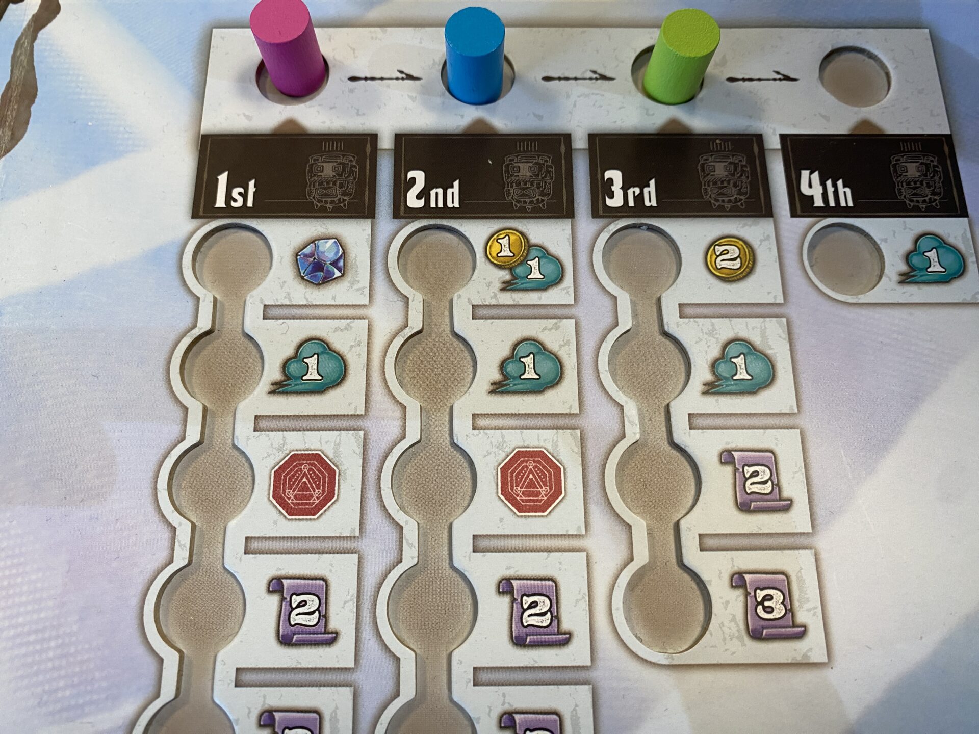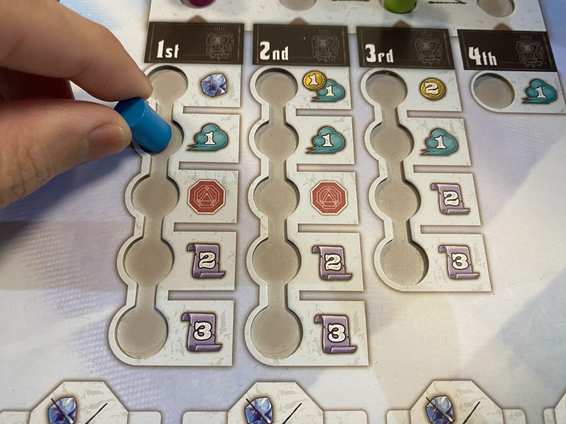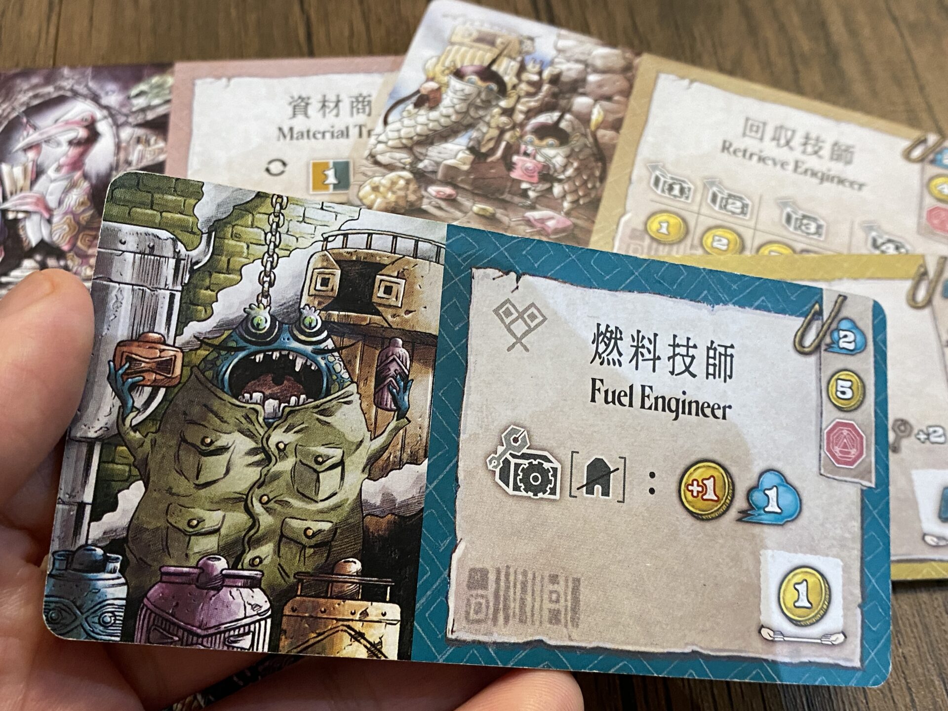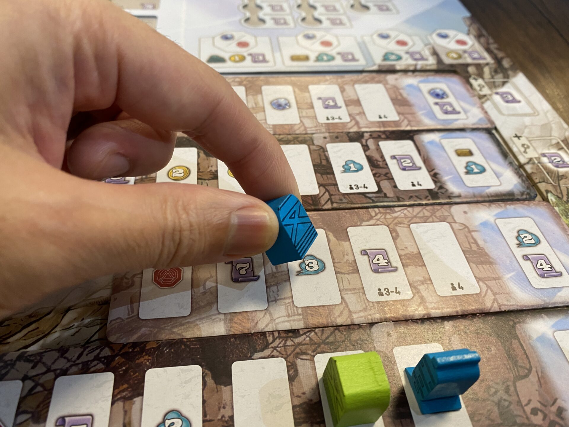 Players set devices on the main board, where there are five tiers, and get resources and victory points. There are 4 devices, such as resource collecting devices or point collecting devices etc. They all have different roles.
