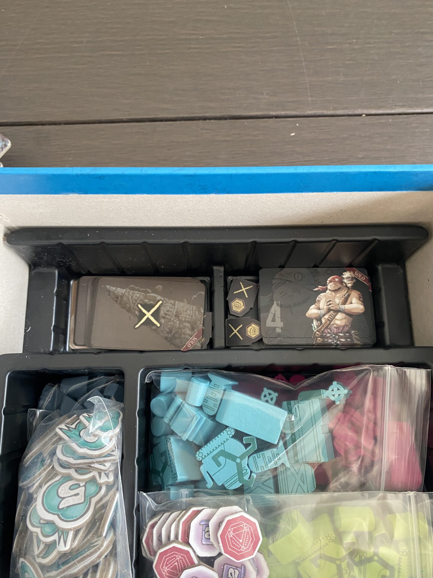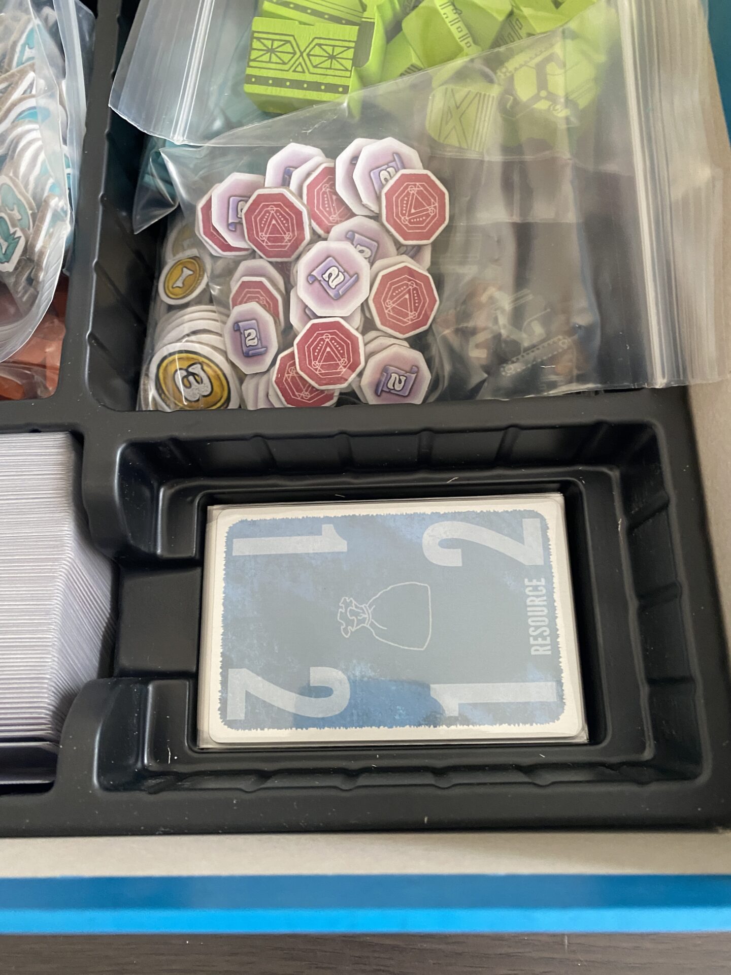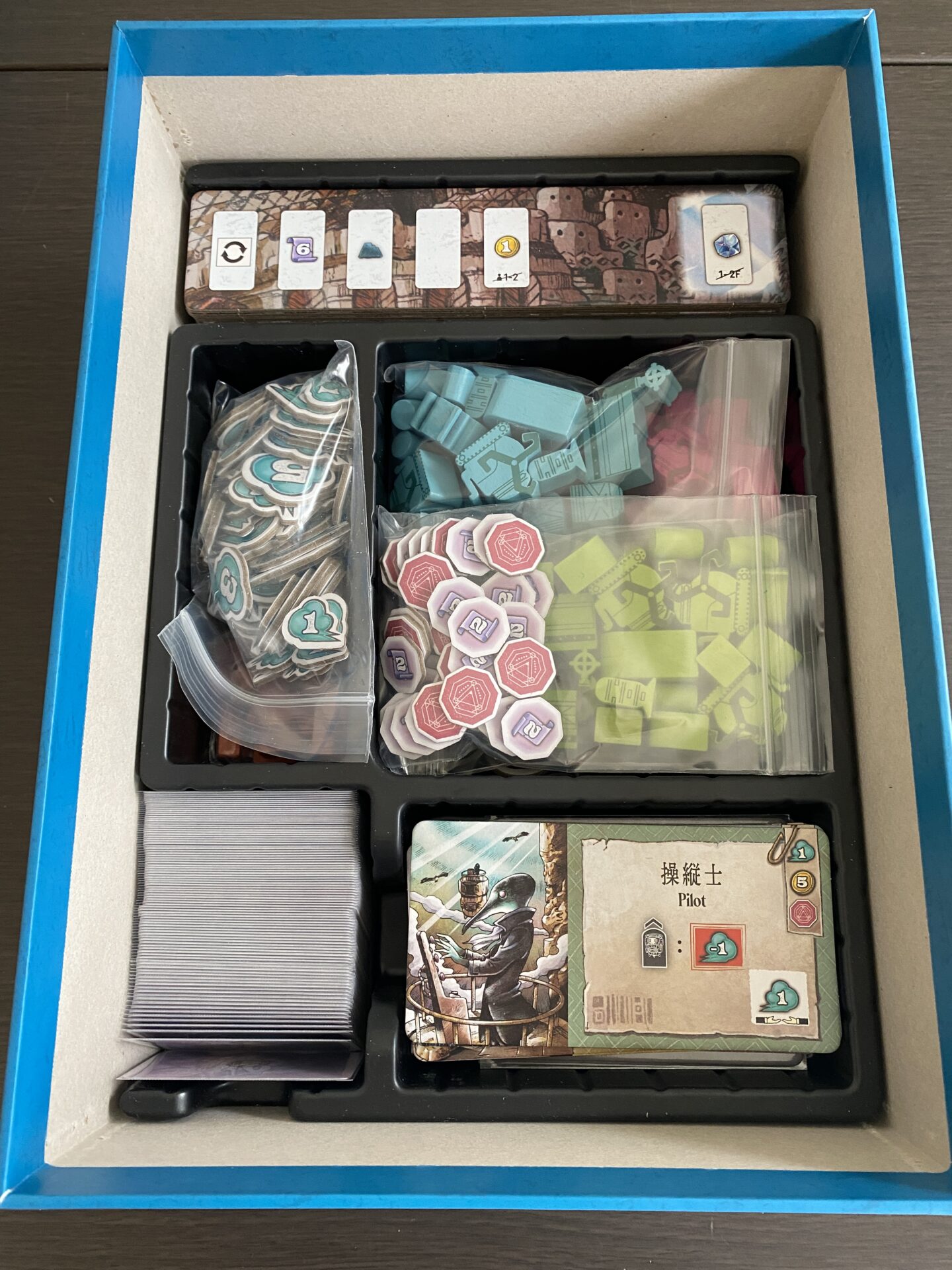 プレイヤーボードとメインボードと、階層タイル(ラウンド)が、透明プラスチックイントレイの上に乗っていて、