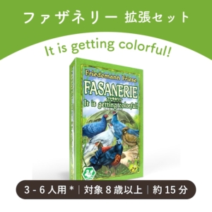 ファザネリー拡張セットはドイツの工場で製造されています。ドイツでは環境に配慮して、様々な取り組みが行われているのですが、その一環として今回の「ファザネリー拡張1:It is getting colorful!」の梱包は、シュリンク無しの簡易包装・カードの包装も紙包装となっております。箱によって多少の歪みや微細な凹みがある場合がございます。基本的に内容物のカード欠品・カード破損以外の外装箱の交換対応などは致しかねますので、ご了承の上でお買い求めくださいませ。